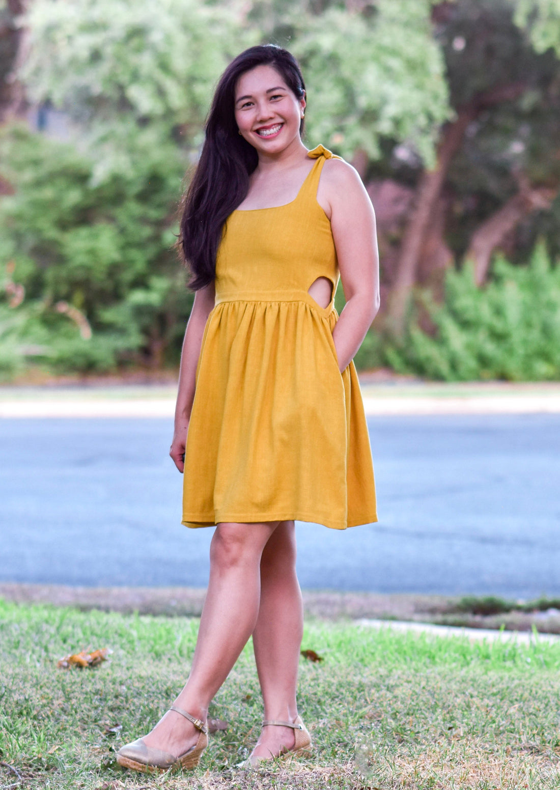 This pattern pairs beautifully with the Wonderful Sews Komorebi Crop Top and Big Effing Cardigan for a comfortable spring or fall outfit. It is recommended, however, that you chose to add a tie back on the top or the skirt, not both.